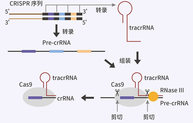 CRISPR 序列转录,形成前体 CRISPR RNA (pre-crRNA),然后在 Cas9 蛋白的帮助下,被剪切成成熟的 tracrRNA-crRNA 双链 RNA 。II 型 CRISPR/Cas9 系统中,这一步由 Cas9 及 RNase III 共同完成。对 pre-crRNA 的剪切需要先合成一段反式激活 crRNA (tracrRNA)。tracrRNA 中有部分碱基序列与 pre-crRNA 上的重复序列存在严格的碱基互补关系。Cas9 及 RNase III 只有在 tracrRNA 与 pre-crRNA 上的重复序列配对形成双链 RNA 的条件下,才能对 pre-crRNA 进行剪切,剪切后,形成成熟的 tracrRNA-crRNA 双链 RNA。tracrRNA-crRNA 双链体被称为 gRNA。Cas9 核酸酶和 gRNA 形成 Cas9 核糖核蛋白 (RNP)。