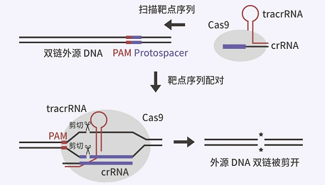 1. 通过 crRNA 中的间隔序列与靶基因 DNA 的 Protospacer 互补配对。