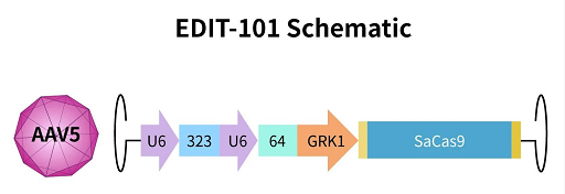 AGN-151587 是一种腺相关病毒 AAV5 病毒载体,装载了 3 个成分,包括: 由 U6 聚合酶 III 启动子控制的 2 个指导 RNA (gRNA) RNA-323 和 gRNA-64,以及通过光受体特异性 GRK1 启动子表达的金黄色葡萄球菌 Cas9。