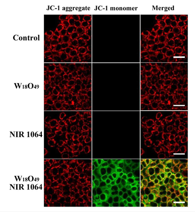 Measurement of mitochondria membrane potential by JC-1 staining. HeLa cells are incubated with or without WOs for 24 h, followed by NIR irradiation for NIR and WOs+ NIR groups (JC-1 purchased from MCE)。