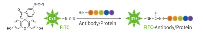 FITC (Fluorescein isothiocyanate) 是应用广泛的、可产生绿色荧光的荧光素衍生物,其异硫氰酸基团可与蛋白的氨基末端或伯胺反应,从而实现包括多肽、抗体等的蛋白标记。