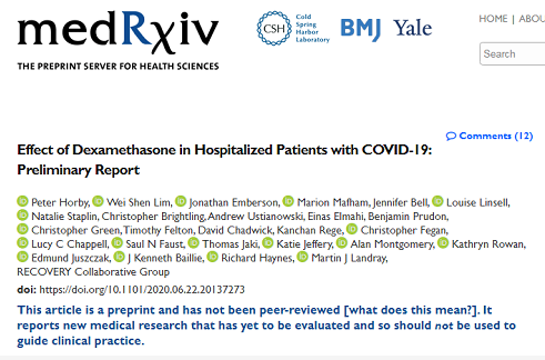 6月16日,牛津大学公布了一项令人振奋的治疗 COVID-19 的临床试验成果:使用地塞米松 (Dexamethasone) 可以显著降低 COVID-19 病人的死亡率。6 月 22 日,该实验成果相关论文被发表在 medRxiv 预印本上 。