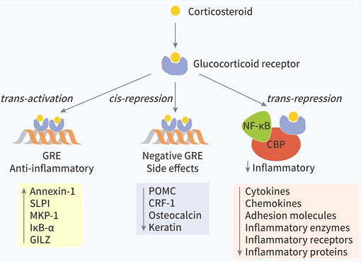 通常情况下,糖皮质激素受体通过与被调控基因启动子区域糖皮质激素应答元件 (Glucocorticoid response elements, GRE) 结合,增强一些抗炎症 (如 Annexin-1, IκB 等) 相关蛋白的表达。少数情况下,糖皮质激素受体也可能跟负向 GRE 结合,抑制相关基因的表达,产生副作用。NF-κB 是控制多种炎性因子如细胞因子、趋化因子、黏附分子、炎症蛋白等表达的主要转录因子。糖皮质激素受体被报道可以通过与 NF-κB 下游的分子结合,从而关闭 NF-κB 控制的炎性因子的表达,起到抗炎的作用 (图 3)。