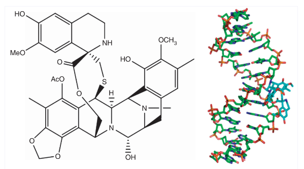 曲贝替定 (Trabectedin; ET-743) 是一种从加勒比海被囊动物红树海蛸(Ecteinascidia turbinata) 体内分离提取出来的烷化剂,是第一个海洋来源的新型抗软组织肿瘤药物。很多来源于海洋的天然产物具有非常新颖的化学结构和独特的药理作用机制。