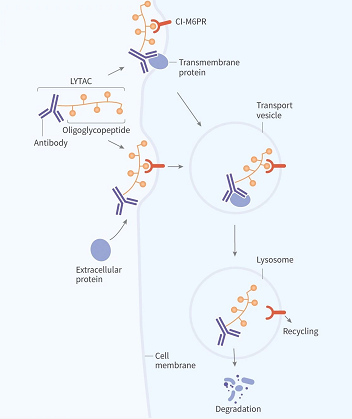 LYTAC 含有两个结合域,一个寡糖肽基团 (Oligoglycopeptide group) 和一个能与目标蛋白质结合的抗体或小分子,两者用 Linker 连接。寡糖肽基团在细胞表面与跨膜受体 CI-M6PR 结合,所得复合物被细胞膜吞没,形成运输囊泡,并在 CI-M6PR 作用下将复合物转移至溶酶体降解,而受体 CI-M6PR 可循环利用并回到细胞膜 (如图 1)。例如通过使用抗 EGFR 单克隆抗体 Cetuximab 与 CI-M6PR 配体 M6Pn 糖多肽缀合构建 LYTAC Ab-2 来降解 EGFR。