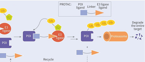 2、通过泛素-蛋白酶体系统靶向降解蛋白:PROTAC 可以与 E3 泛素连接酶和靶蛋白结合,诱导形成三元复合物,导致多聚泛素化并随后降解靶蛋白。PROTAC 可以回收继续利用 (图 2)。