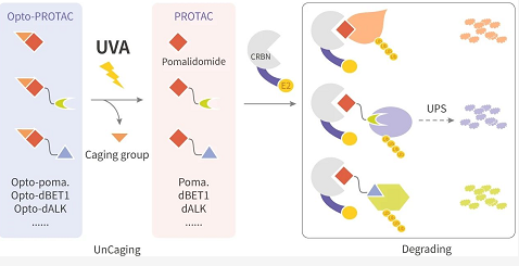 今年年初 Science Advances 上的两篇背靠背文章,分别发表了关于光控的精准时空激活的 PROTAC。其中哈佛医学院和西奈山医学院研究团队设计了 opto-PROTACs。他们通过在泊马度胺 (Pomalidomide) 上添加一个对光不稳定的 Caging 基团,暂时阻止 Pomalidomide 与 E3 连接酶 CRBN 的相互作用,之后利用紫外线 A (UVA) 照射,opto-pomalidomide 分子以时间依赖性方式进行光解,从笼状 (Caged) 状态中解开,并成功介导 IKZF1/3 降解。他们据此原理设计的光控 opto-dBET1 以及 opto-dALK 也都分别成功介导了 BRD 蛋白和 ALK 融合蛋白的降解 (图 3)。