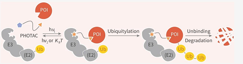 与大多数小分子抑制剂主要阻断目标酶的催化活性不同,PROTACs 旨在降解目标蛋白。这种特性提供了优势的同时也有潜在的弊端,当全身给药时,它可能会导致正常细胞中的目标蛋白不受控制的降解,产生非特异性毒性。而光控开关 PROTACs 正是在 PROTAC 上添加一个可控的开关,使它在黑暗中无活性,特定波长的可见光下会被激活,降解目标蛋白。因此,光控开关 PROTACs 能够在癌细胞或组织中激活,在时间和空间上精准地控制靶向蛋白降解,消除潜在的非特异性毒性。