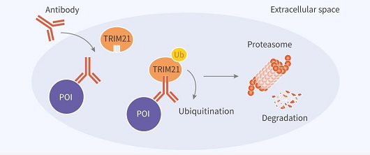 Trim-Away,一种在细胞内快速降解目标蛋白的新技术。它利用内源性泛素连接酶 TRIM21 识别抗体的 Fc 区来降解蛋白抗体复合物。TRIM21 是一种 E3 泛素连接酶,可与抗体的 Fc 结构域高亲和力结合。