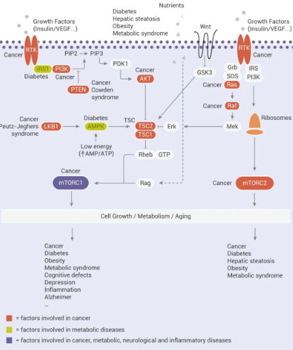 mTOR 是细胞生长和代谢的主要调节分子,可促进合成代谢过程,如核糖体的生物发生 (Ribosome biogenesis) 以及蛋白质、核苷酸、脂肪酸和脂质的合成,并抑制分解代谢过程,如自噬。mTOR 信号的失调与许多人类疾病有关,包括糖尿病、神经退行性疾病和癌症。