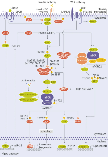 mTOR 通过与 mTORC1 或 mTORC2 的关键组分如 Raptor、Rictor、LST8 和 SIN1 作用,催化多个靶标的磷酸化,如 S6K1、4E-BP1、Akt、PKC、 IGF-IR 和 ULK1,从而调节蛋白合成、营养代谢、生长因子信号传导、细胞生长和迁移以及调节自噬等。