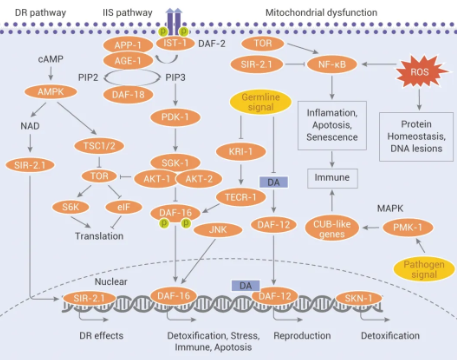目前,已经确定了几种衰老相关的关键信号通路,包括 Insulin/IGF-1 signaling (IIS)、mTOR、AMPK、NF-κB 和 Sirtuins 通路。这些信号传导途径感应营养物质或代谢产物,调节葡萄糖、氨基酸、cAMP 和 NAD+ 的水平,并形成复杂的与长寿和衰老相关的网络。