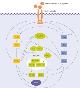 值得注意的是,IIS 通路可与 mTOR 相互联系调节衰老,例如 IIS 通过 AKT 激活了 mTORC1,而 mTORC1 可以通过 S6K 负调控 IIS,从而抑制了胰岛素受体底物 1 (IRS-1)。研究表明,降低 IIS 信号转导可延长线虫、果蝇和小鼠的寿命。