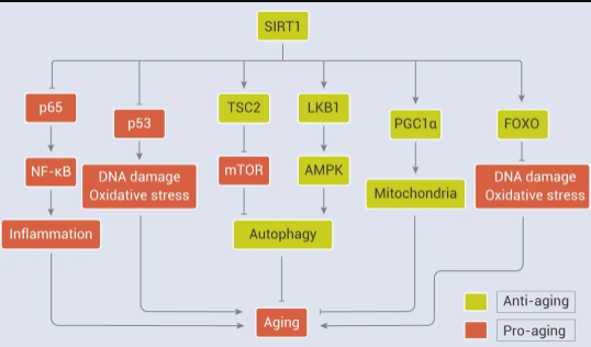 Sirtuins 在调节多种细胞过程中非常重要,如代谢、线粒体内稳态、自噬、DNA 修复、凋亡、氧化/抗氧化平衡和衰老。其中,SIRT1 催化组蛋白 H1、H3 和 H4 以及非组蛋白脱乙酰化,包括 p53、Ku70、FoxOs、PGC1-a、PPAR-γ 和 NF-κB,并通过这些底物的乙酰化和脱乙酰化改变它们的转录和酶活性以及蛋白质水平,广泛参与调节细胞衰老和生物体寿命。除此之外,SIRT1 还可通过整合多种信号参与衰老调节。
