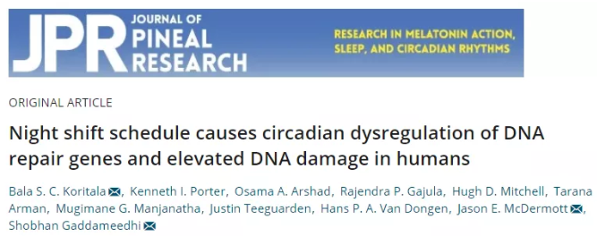 近期,Journal of Pineal Research 刊登了华盛顿州立大学研究人员题为 Night shift schedule causes circadian dysregulation of DNA repair genes and elevated DNA damage in humans 的文章,该研究证明,受试者暴露于打破昼夜节律性的夜班后,对内源性和外源性 DNA 损伤的敏感性都有所提高,DNA 损伤加剧,且 DNA 修复异常,癌症风险升高,揭示了昼夜节律紊乱引发癌症可能的机制。