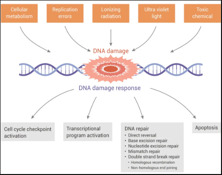DNA 损伤可以是 DNA 碱基的化学添加或破坏 (产生异常的核苷酸或核苷酸片段),也可能是 DNA 单链断裂 (SSB) 和双链断裂 (DSB) 。目前已经鉴定出至少 5 种 DNA 修复途径:同源重组修复 (HR)、非同源性末端接合修复 (NHEJ)、碱基切除修复 (BER)、核苷酸切除修复 (NER)、错配修复 (MMR)。