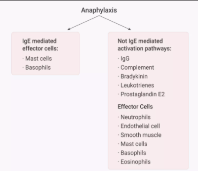 过敏反应是由肥大细胞和嗜碱性粒细胞释放的介质所触发的系统性的,甚至危及生命的疾病,其通过过敏 (IgE 介导) 或非过敏 (非 IgE 介导) 机制激活。它是一个快速发展的多系统过程,涉及皮肤、肺、胃肠和心血管系统。典型的临床症状包括支气管收缩、血管扩张和低血容量,可导致呼吸功能不全、休克和死亡。