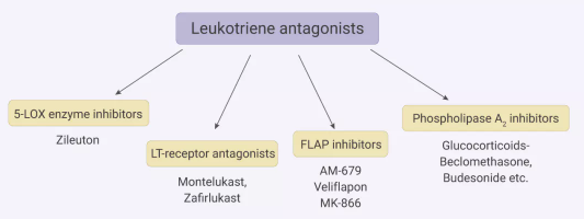 在哮喘中,白三烯受体拮抗剂是最常用的药物之一。这类药物通过与 CysLT 受体结合并阻断其活化和随后的炎症级联反应来发挥作用。除此之外,与白三烯合成相关的其他靶点也是潜在的靶向过敏的药物,例如 5-LOX 合酶抑制剂 Zileuton,FLAP 抑制剂 AM-679、Veliflapon,以及可抑制磷脂酶 A2 (PLA2) 的糖皮质激素 Budesonide。顺便提一下,糖皮质激素本身也具有强大的抗炎、抗过敏和免疫抑制作用。糖皮质激素能够抑制过敏原暴露后引起的一些介质 (一氧化氮、白三烯和前列腺素) 的产生,是抗过敏性疾病的有效的药物,如过敏性鼻炎。