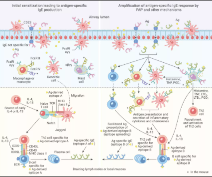 当我们第一次接触到过敏原时,不会有明显的反应。过敏原通常是分子量相对较低、相对稳定的蛋白质,它们更容易以天然构象进入体皮肤、肺部等。→ → 免疫系统可能通过局部树突状细胞摄取蛋白质抗原,即过敏原,开始识别目标分子。树突细胞利用溶酶体蛋白酶将这些蛋白质加工成长度可变的肽段,随后将肽段呈递到 MHC II 类分子上并呈给幼稚 T 细胞。→ → 在没有特别危险信号 (如寄生虫) 时 ,T 细胞通常分化为 2 型 T 辅助细胞,即 Th2 细胞。这些 Th2 细胞产生 IL-4 和 IL-13,并刺激 B 细胞经历抗体类别转换,产生 IgE 抗体。IgE 会与肥大细胞和嗜碱性粒细胞上表达的高亲和力 IgE 受体 (FcεRI) 交联,产生并引发信号级联反应。→ → 释放包括组胺、前列腺素和白三烯在内的介质,当这些介质从细胞中释放出来时,就会产生过敏的典型症状,包括组织肿胀、支气管收缩和血压下降。