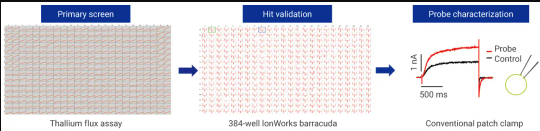 流程:稳定表达 KCNQ2 通道的 CHO 细胞 → 与染料缓冲液共培养 → 在细胞板中加入不同的化合物孵育 → 铊通量分析初步筛选 → 384 孔全自动膜片钳系统进行撞击验证 → 自动化膜片钳二次筛选。