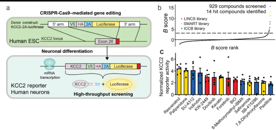 以 Pharmacological enhancement of KCC2 gene expression exerts therapeutic effects on human Rett syndrome neurons and Mecp2 mutant mice 一文为例,作者团队通过开发建立了一种应用于神经元的高通量筛选方法。该文献中,结合使用了 CRISPR-Cas9 技术,将荧光素酶报告基因插入人 ES 细胞的内源 KCC2 基因位点中,通过检测荧光来筛选特异性增强 KCC2 达的化合物,最终从 900 种化合物中筛选出 14 个 KEECs。