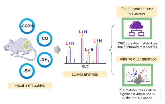 武汉大学冯钰锜教授团队,通过用稳定同位素标记的液相色谱质谱分析方法 (CIL-LC-MS),对小鼠粪便样品中四种类型代谢物 (羧基、羰基、胺和硫醇代谢物) 进行了测定,代谢物通过与含有稳定同位素标记的物质 (如 DMED-d4、HIQB-d7、DMAP-d4、BQB-d7) 衍生化 (化学反应) 以提高代谢物检测的灵敏度,共检测到了 2302 种潜在代谢物,其中有 1388 种代谢物可被推测,通过化学标记标准库和质谱分析,确定了 308 种代谢物。