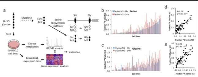 稳定同位素分析代谢组学 (Stable Isotope Resolved Metabolomics,SIRM) 是一种利用先进的 NMR 和 MS 分析方法,分析稳定同位素富集的前体到产物的单个原子的的过程,根据稳定同位素原子的跟踪,可以揭示一些新的代谢途径及治疗靶点,SIRM 在肿瘤代谢研究中发挥了重大作用。DeNicola GM 等人用 U-13C-glucose 通过对非小细胞肺癌 (NSCLC) 细胞株的代谢跟踪,研究了 NSCLC 中 Serine/Glycine 代谢路径,对 NSCLC 的诊断和治疗发挥了重要作用。