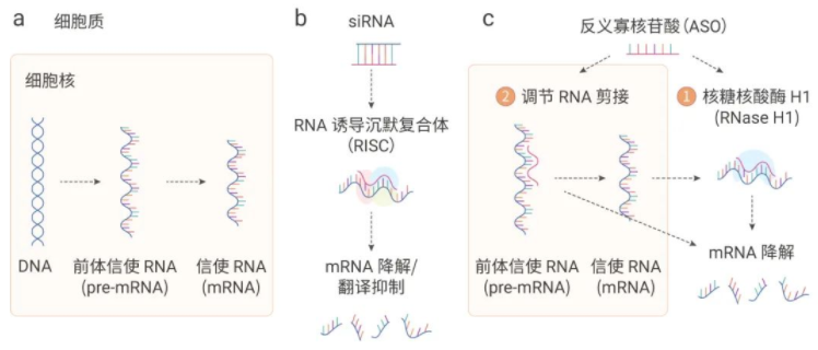 a. DNA到RNA 的转录机制 b. siRNA 的作用机制 c. ASO 的作用机制