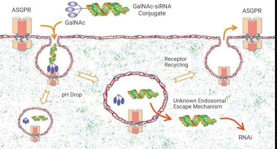 2' 化学修饰大大提高了核酸的稳定性和整体半衰期,实现了裸的小核酸药物与靶向结构域直接偶联,从而避免了脂质纳米颗粒的使用。此外,一些小核酸药物还会在 3' 末端偶联 GalNAc (去唾液酸糖蛋白受体 ASGPR 的配体)(图 3),加入的 GalNAc 部分高亲和性地与 ASGPR 的结合,随后被内吞进入细胞。ASGPR 仅在肝组织中特异性的表达,所以 GalNAc 偶联修饰可以将小核酸药物靶向到肝组织。