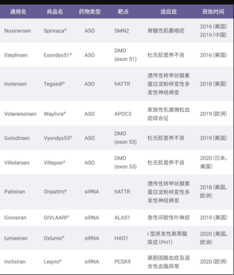 目前,针对多种罕见疾病 (如杜氏肌营养不良 (Duchenne muscular dystrophy)、遗传性转甲状腺素蛋白淀粉样变性多发性神经病变 (Transthyretin familial amyloid polyneuropathy)、急性卟啉症 (Acute intermittent porphyria) 等) 的小核酸药物已经获批上市。