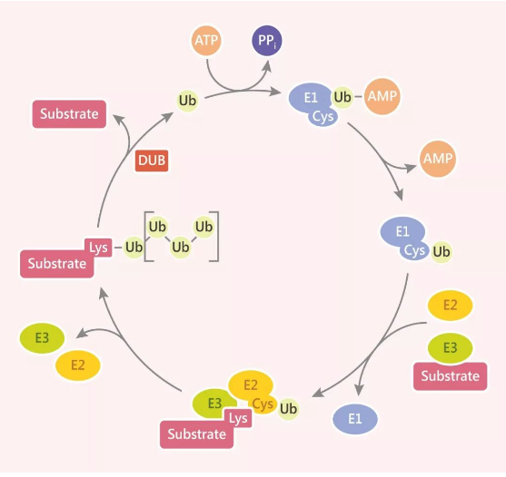 泛素 (Ub) 是真核细胞中广泛表达的一种高度保守的小分子蛋白,由 76 个氨基酸组成。泛素共价结合到靶蛋白上被称为“泛素化”,泛素化是一种重要的蛋白质翻译后修饰 (PTM)。泛素化在控制蛋白的稳定和功能中起重要作用,并调节了多种细胞过程,例如细胞分裂和分化、环境应激反应、细胞分化、免疫反应、DNA修复和凋亡。著名的泛素-蛋白酶体途径 (UPP) 是主要的胞质蛋白水解机制,能选择性降解各种形式的受损蛋白。 泛素化修饰由三类酶催化完成:1) 泛素激活酶 E1 激活泛素蛋白;2)激活的泛素转移到泛素结合酶E2 的 Cys残基上;3)泛素由E3连接酶连接到靶蛋白的赖氨酸残基上。