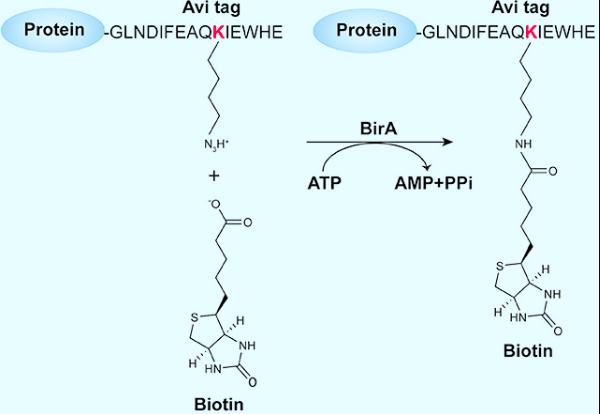 生物素化 (Biotinylation) 是将生物素以共价键连接到分子 (如氨基酸或蛋白质) 上的过程。由于生物素很小,生物素化通常快速且具有特异性,不易干扰分子固有功能。生物素与链霉亲和素或抗生物素蛋白的结合具也有极高的亲和力、快速性和高特异性,因此,生物素化被广泛应用于生物医学领域,生物素化蛋白作为一种分子工具广泛用于生物技术。AviTag? 是常用的融合标签,Avi-Tag 是一种15个氨基酸残基组成的小标签,能被大肠杆菌生物素连接酶 BirA 有效生物素化,可添加在蛋白的N或C端,实现蛋白的生物素化,用于蛋白纯化或显影等。
