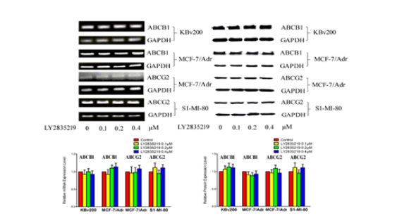 LY2835219对MDR细胞中ABCB1或ABCG2表达的影响。Western blot检测0、0.1、0.2和0.4 μM LY2835219刺激MDR细胞48h后ABCB1和ABCG2蛋白表达水平,PCR检测mRNA表达水平(GAPDH为加载对照)。