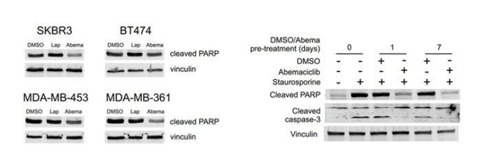 用DMSO、GW572016或Abemaciclib处理SKBR3、BT474、MDA-MB-453和MDA-MB-361细胞48小时进行Western blot。用DMSO或Abemaciclib (500 nM)预处理MDA-MB-453细胞0、1或7天,然后用Staurosporine (500 nM)处理4小时。