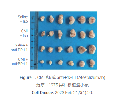 实验结果:氯米帕明 (CMI) 和 anti-PD-L1 (Atezolizumab) 联合治疗可有效抑制肺腺癌