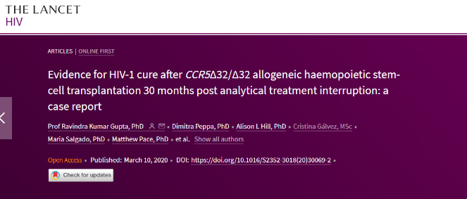 2020 年 3 月 10 日,英国剑桥大学教授 Ravindra Kumar Gupta 等人在 Lancet HIV 上发表了题为 "Evidence for HIV-1 cure after CCR5Δ32/Δ32 allogeneic haemopoieticstem-cell transplantation 30 months post analytical treatment interruption: acase report" 的文章引起了广泛关注。研究中 "伦敦病人" 接受了 CCR5Δ32 /Δ32 同种异体造血干细胞移植后, 经过 30 个月的监测,其血液,脑脊液,肠组织或淋巴组织中均未检测到具有复制能力的病毒,最终被认定为 HIV 治愈。时隔多年“治愈”二字再次与 HIV 相遇,CCR5 又一次登上了“神坛”。