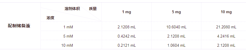 请根据产品在不同溶剂中的溶解度选择合适的溶剂配制储备液;一旦配成溶液,请分装保存,避免反复冻融造成的产品失效。