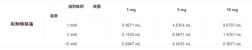 * 请根据产品在不同溶剂中的溶解度选择合适的溶剂配制储备液;一旦配成溶液,请分装保存,避免反复冻融造成的产品失效。