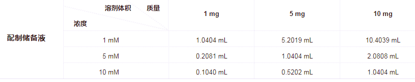 * 请根据产品在不同溶剂中的溶解度选择合适的溶剂配制储备液;一旦配成溶液,请分装保存,避免反复冻融造成的产品失效。